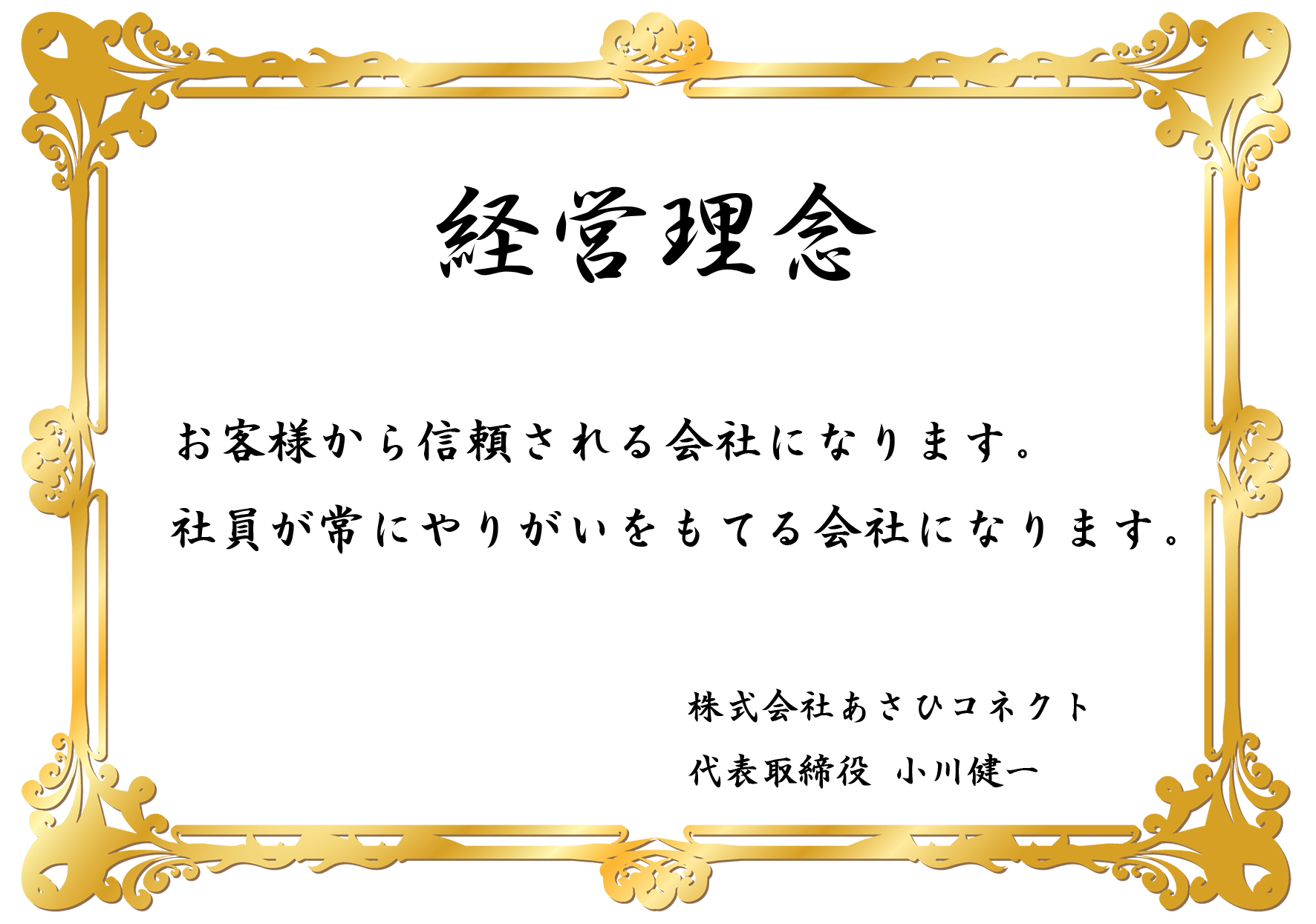 ●お客様の「笑顔」のために、期待を超える感動を。 私たちは、お客様一人ひとりの期待を上回るサービスを提供し、心からの笑顔と信頼を築きます。 お客様の「安心」と「満足」こそが、私たちの最高の喜びです。 ●社員一人ひとりの「情熱」が、未来を創る原動力。 私たちは、社員一人ひとりの情熱と誇りを尊重し、共に成長できる最高の職場環境を追求します。 互いに高め合い、夢を分かち合い、未来を切り拓く仲間であり続けます。